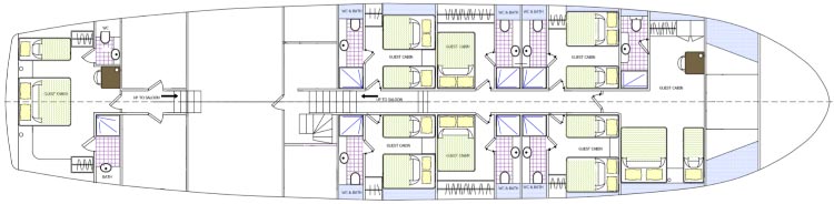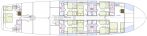 For up to 21 guests in 8 comfortable and spacious cabins, including 1 master cabin with one double & one single bed (triple), 1 master cabin with a double bed, 4 cabins with one double & one single bed (triple) and 2 cabins with a double bed. The en suite bathrooms have shower cubicles and electrical toilets (in 3 cabins at the stern) or house-type flush toilets (in 5 cabins at the front). She has very spacious uncluttered superstructure and sun deck areas as well as aft deck area. She is fully equipped with air-conditioning, dining facilities in the saloon and two separate dining areas on the deck with dining table and chairs, spacious sun deck area with cushions, spacious cushioned aft deck area. Separate crew quarters.